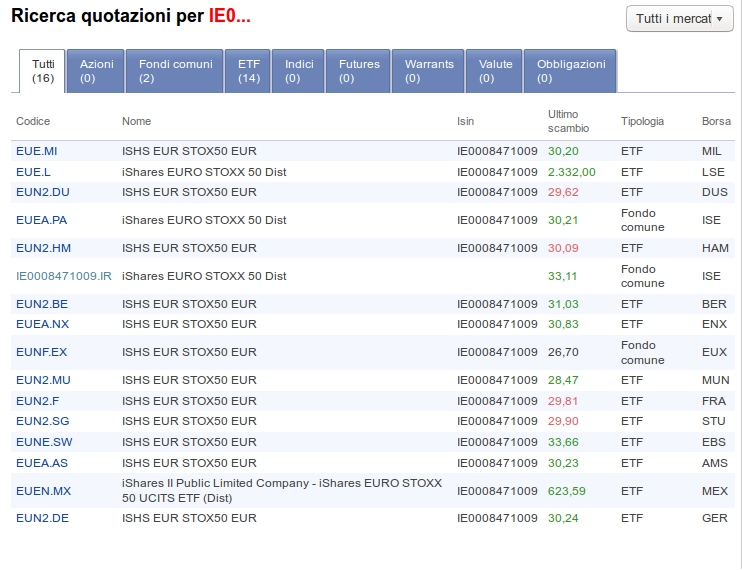 Se cerchi un ETF su un sito specializzato, o se magari vuoi comprare quelli che formano i portafogli modello dell’Investment Club, ti trovi di fronte a numerose alternative. Lo stesso prodotto, infatti, può essere quotato su più mercati (non solo in Italia) e questo crea un po’ di confusione. Prendi, ad esempio, il titolo IE0008471009. Esso è quotato su diverse borse: se inserisci il codice che ti ho appena dato su yahoo finanza troverai infatti una serie piuttosto ampia di alternative, come puoi vedere qui: